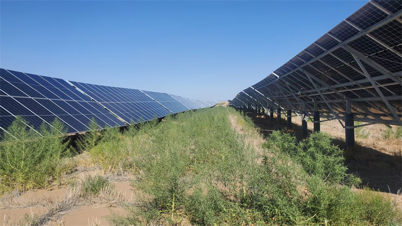 項(xiàng)目年上網(wǎng)電量達(dá)0.960275億千瓦時(shí),每年可節(jié)約標(biāo)準(zhǔn)煤約2.91萬噸、減排二氧化碳約7.9萬噸。隨著生態(tài)的改善,周邊興起了耐沙作物種植產(chǎn)業(yè),農(nóng)戶參與植被管護(hù)、作物種植獲得穩(wěn)定收入,實(shí)現(xiàn)了生態(tài)、經(jīng)濟(jì)、社會(huì)效益統(tǒng)一。